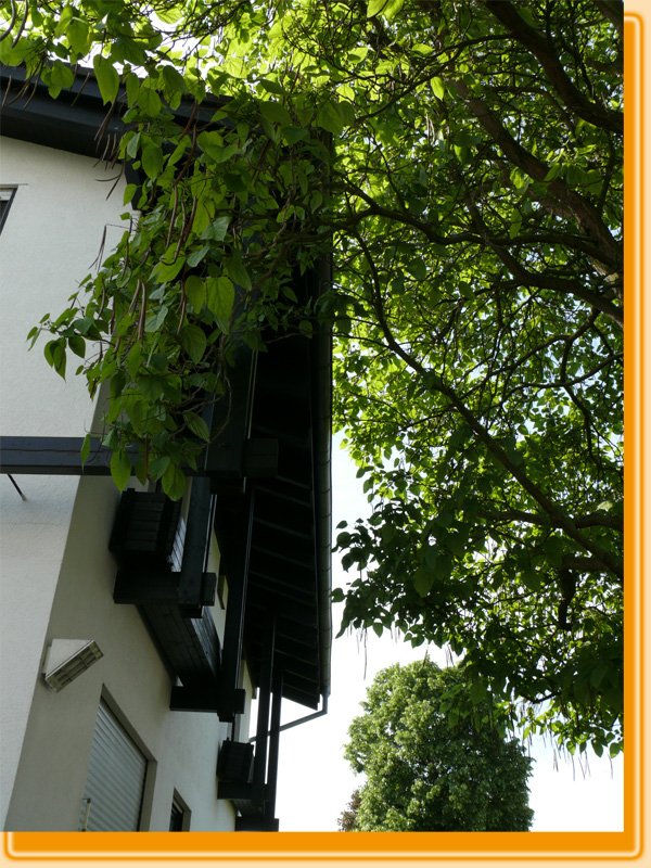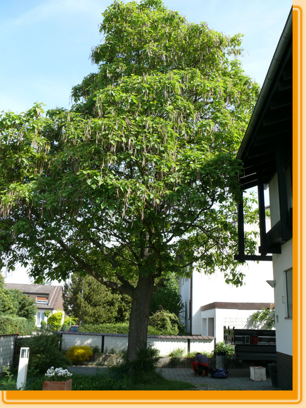 Die Fotos zeigen eine Catalpa in Osthofen vor und nach dem Kronenschnitt, der in erster Linie der Freistellung von Dach und Fassade galt.