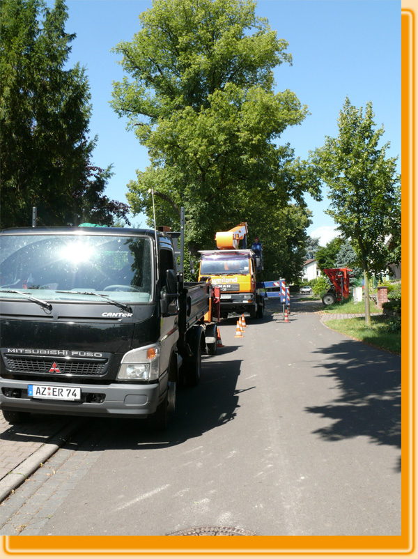 Ist es notwendig und sinnvoll, arbeiten wir mit Hubarbeitsbühnen, um Baumarbeiten angemessen ausführen zu können. Dies ist häufig im Bereich von Straßenbegleitgrün der Fall. Die Fotos zeigen Baumarbeiten im Straßenbereich der Verbandsgemeinde Monsheim bei Worms/ Rhein.