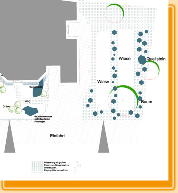 Das Bild zeigt einen Ausschnitt der Bestandsaufnahme eines Hausgartens zur Umgestaltung verschiedener Bereiche in der Gartenanlage.