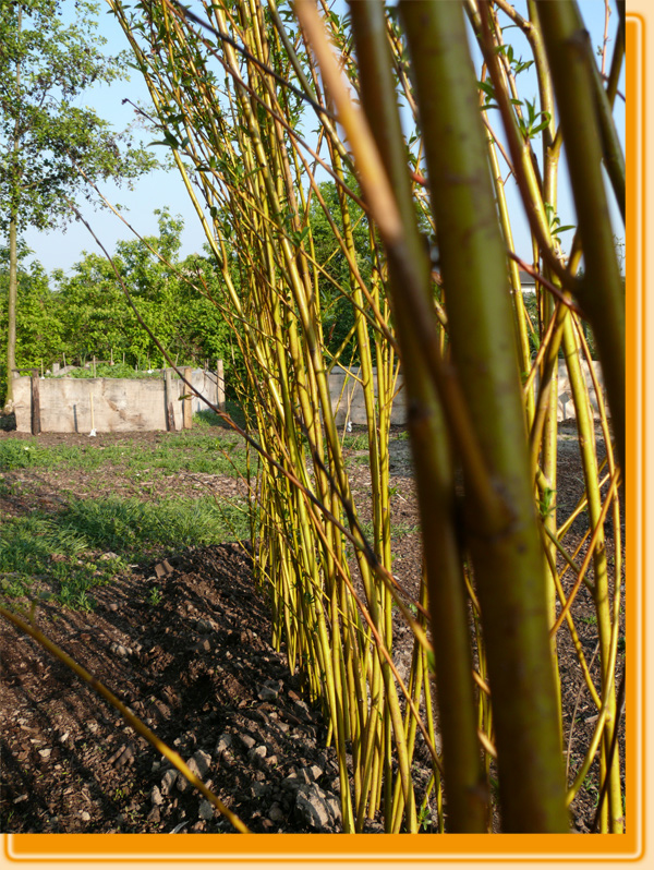 Ein Beispiel für Gestaltung mit lebendem Material ist sicher das Stecken von Ruten unterschiedlicher Gehölze (hier klassisch die Weidenruten). In unterschiedlicher Form verarbeitet, bieten solche Maßnahmen gestalterische Vielfalt im Garten oder ökologischen Nutzen auf Grünflächen zum Erhalt bestimmter Arten oder bspw. als Erosionsschutz.
